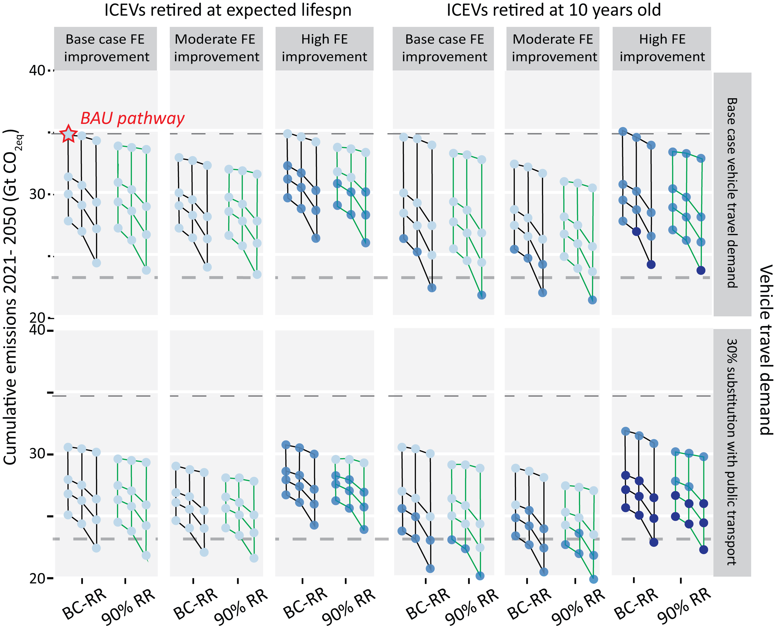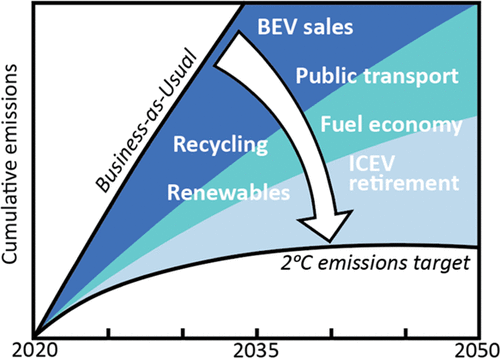 Making, driving, and disposing of U.S. light-duty vehicles (LDVs) account for 3% of global greenhouse gas emissions related to energy and processing. This study calculates future emissions and global temperature rises attributable to U.S. LDVs. We examine how 2021–2050 U.S. LDV cumulative emissions can be limited to 23.1 Gt CO2equiv, helping to limit global warming to less than 2 °C. We vary four vehicle life cycle parameters (transport demand, sales share of alternative fuel vehicles, vehicle material recycling rates, and vehicle lifespans) in a dynamic fleet analysis to determine annual LDV sales, scrappage, and fleet compositions. We combine these data with vehicle technology and electricity emission scenarios to calculate annual production, use, and disposal emissions attributable to U.S. LDVs. Only 3% of the 1512 modeled pathways stay within the emission limit. Cumulative emissions are most sensitive to transport demand, and the speed of fleet electrification and electricity decarbonization. Increasing production of battery electric vehicles (BEVs) to 100% of sales by 2040 (at the latest) is necessary, and early retirement of internal combustion engine vehicles is beneficial. Rapid electricity decarbonization minimizes emissions from BEV use and increasingly energy-intensive vehicle production. Deploying high fuel economy vehicles can increase emissions from the production of BEV batteries and lightweight materials. Increased recycling has a small effect on these emissions because over the time period there are few postconsumer batteries and lightweight materials available for recycling. Without aggressive actions, U.S. LDVs will likely exceed the cumulative emissions budget by 2039 and contribute a further 0.02 °C to global warming by 2050, 2.7% of the remaining global 2 °C budget.